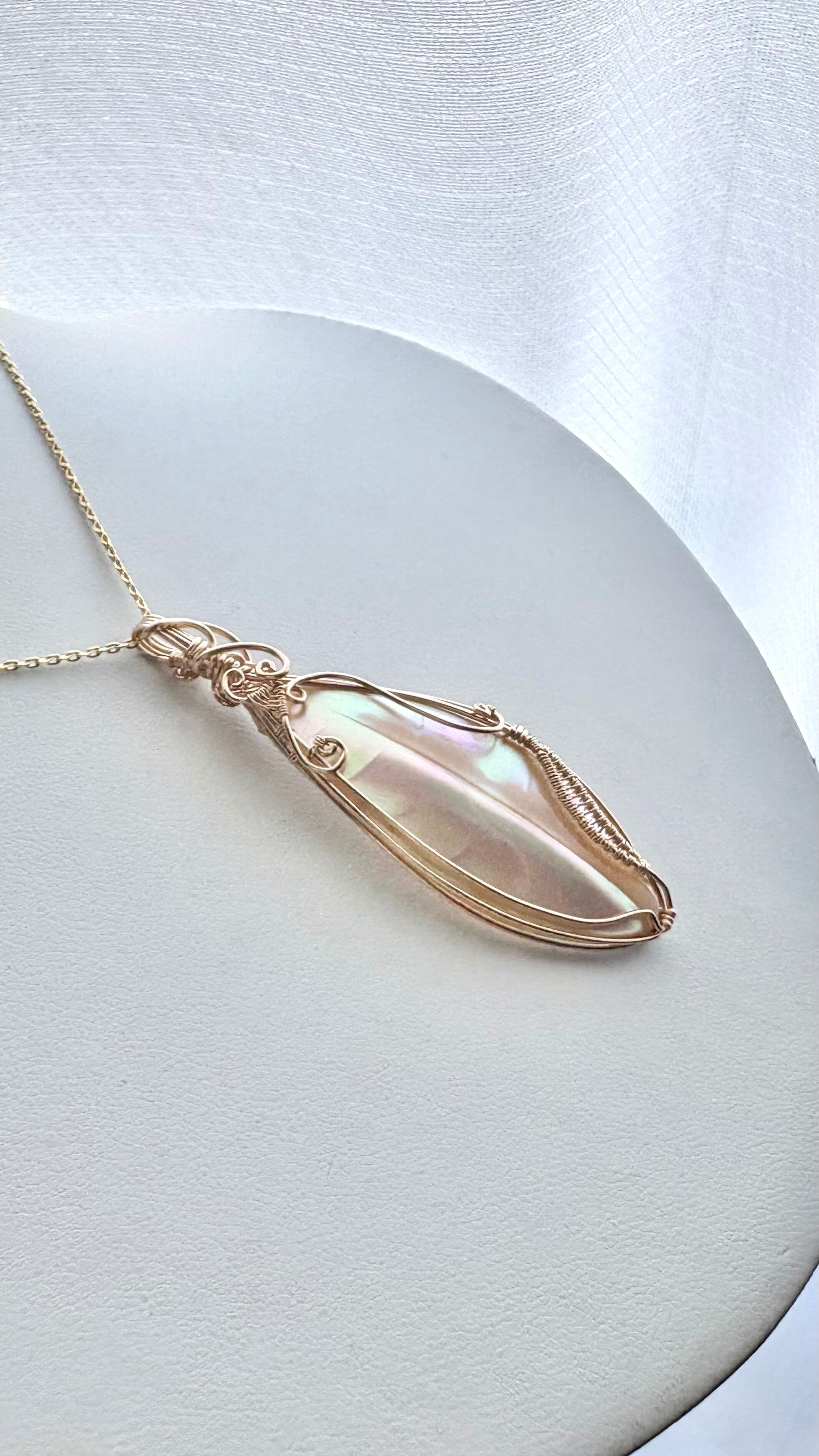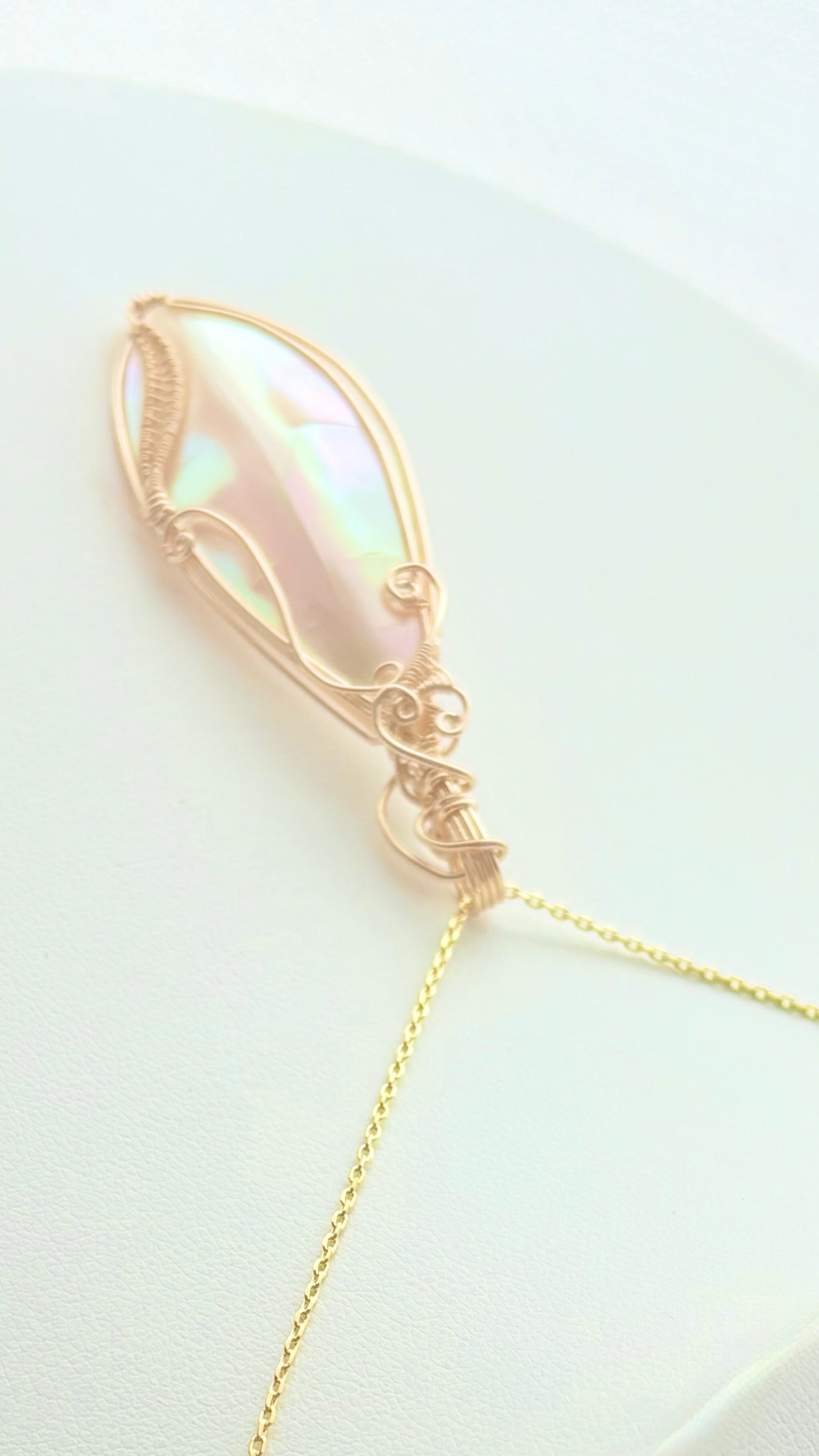 葉のようなフォルムで、表面には葉脈のような模様が浮かぶ、世界に一つの夜光貝の葉