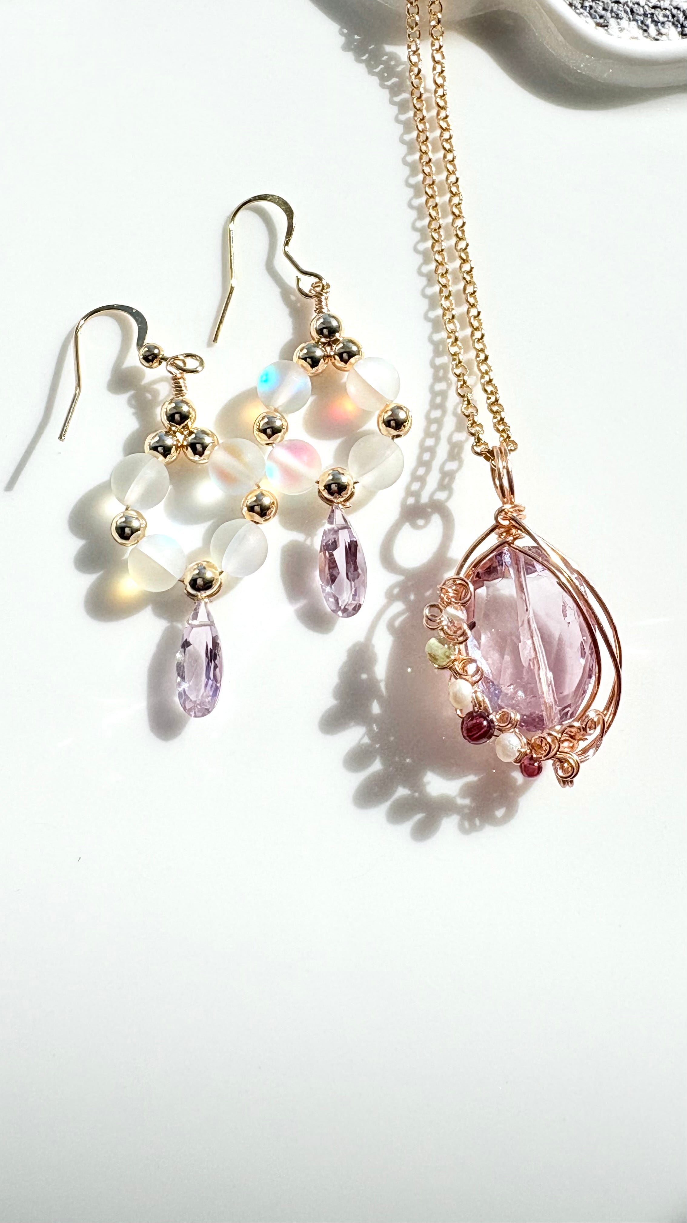 ピアスはルナフラッシュと、AAAランクのピンクアメジストをドロップにおつけしております