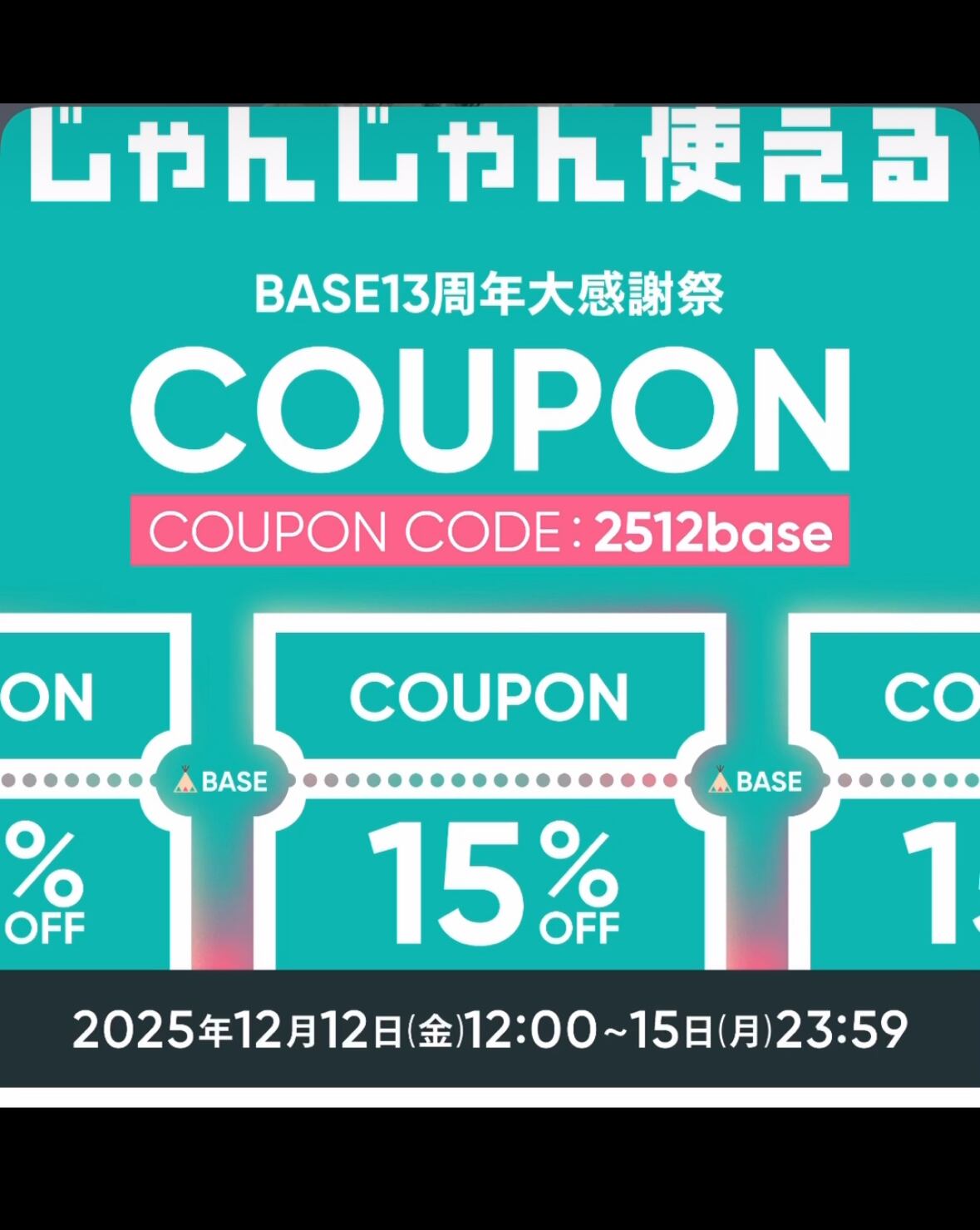 2025年に13周年を迎えたBASEでは、日ごろの感謝の気持ちを込めて、2025年12月12日(金)~15日(月)にクーポンキャンペーンを実施します。