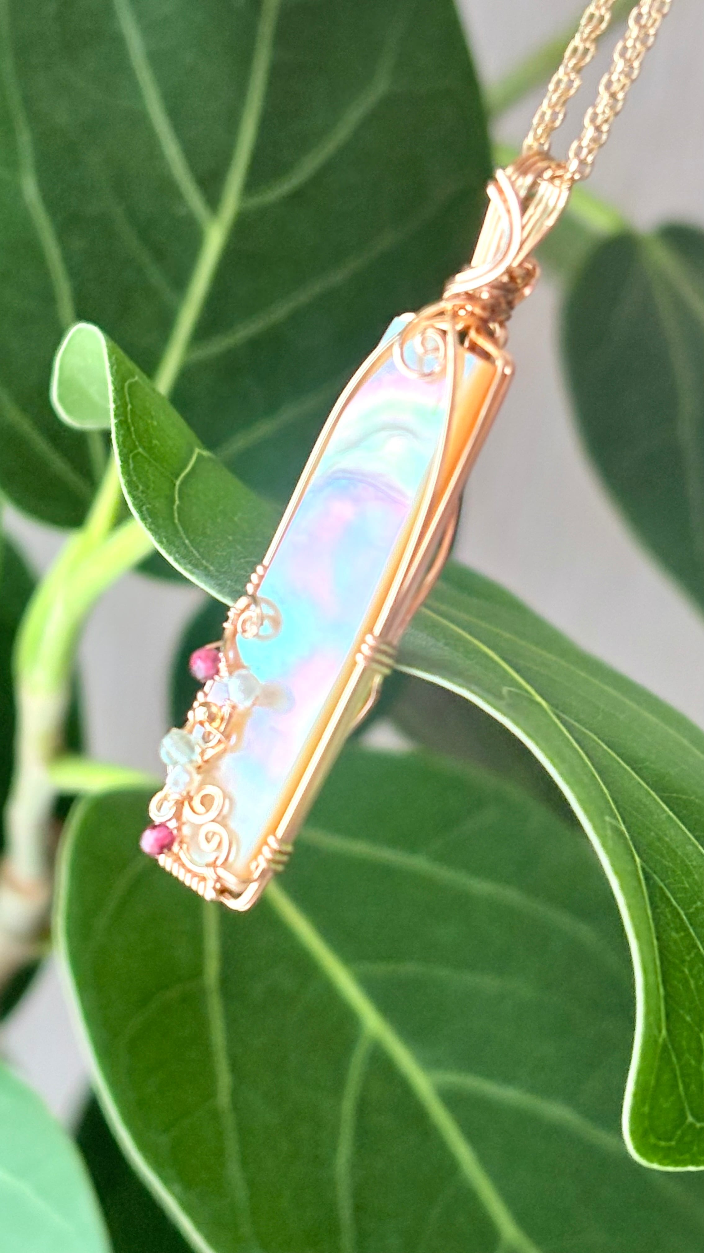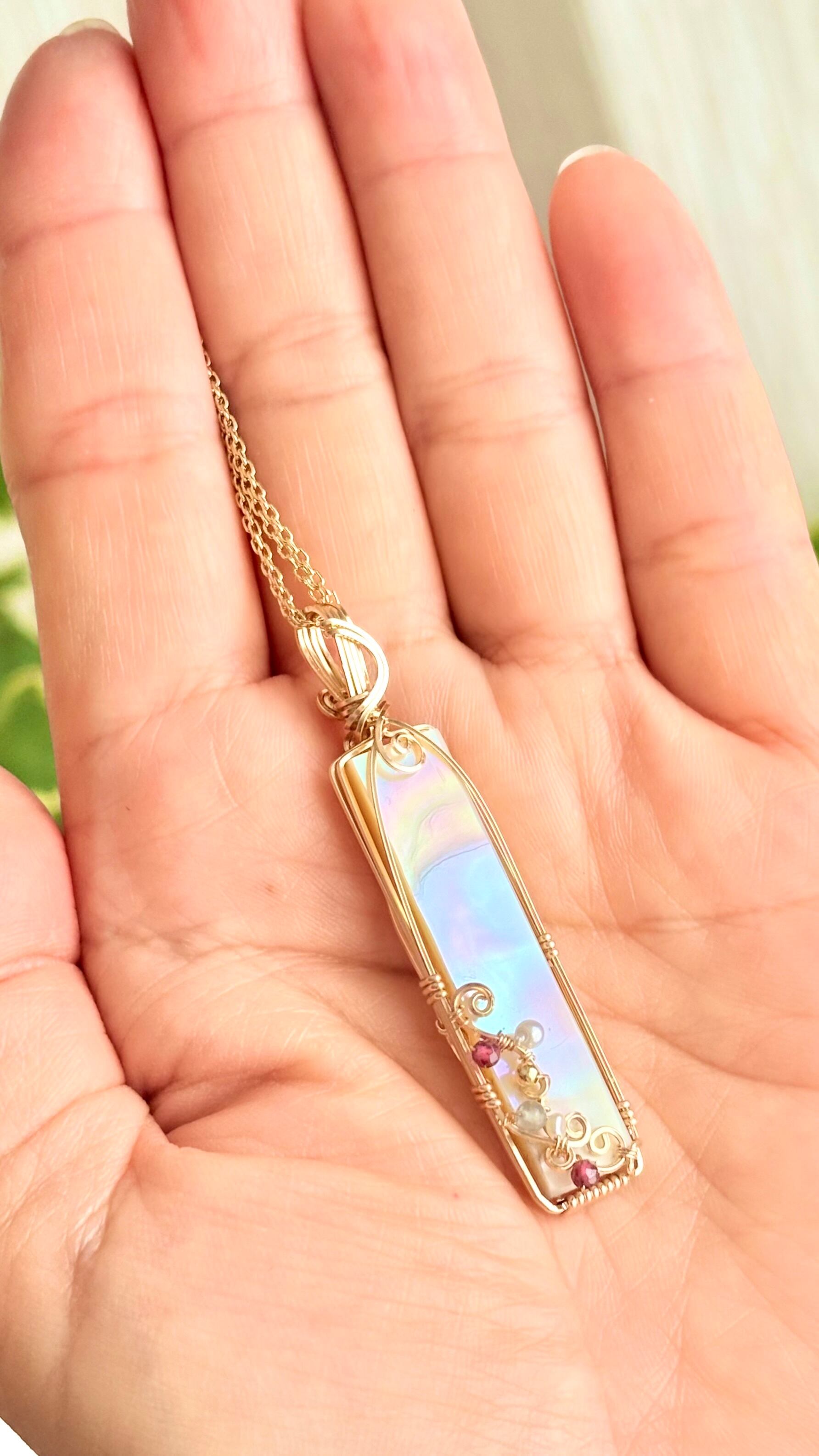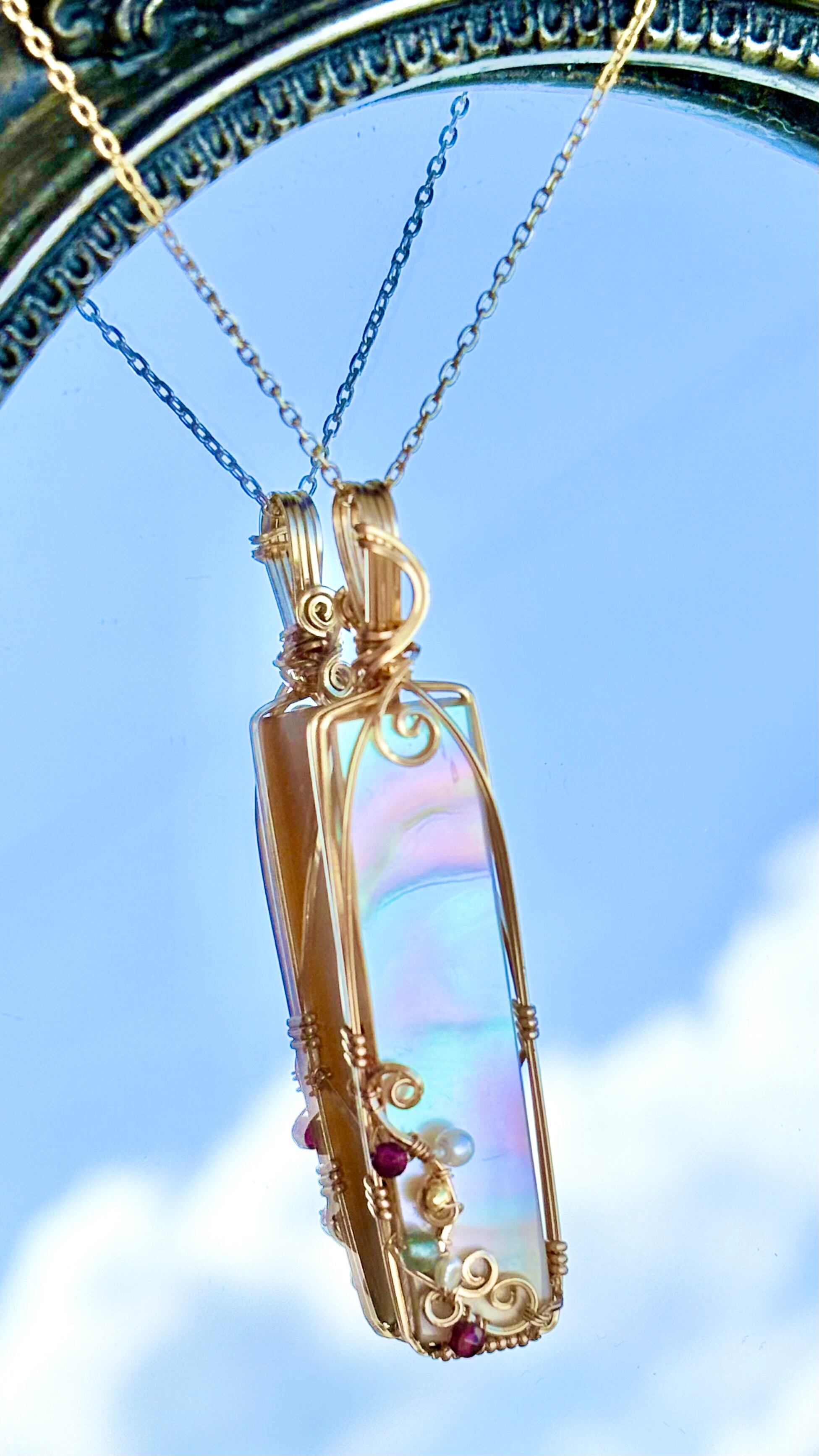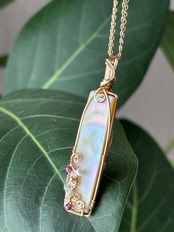 大きな大きな夜光貝を丁寧にカットし、研磨したこのジュエリーは、内なる声と繋がるサポートとなるように制作しました
