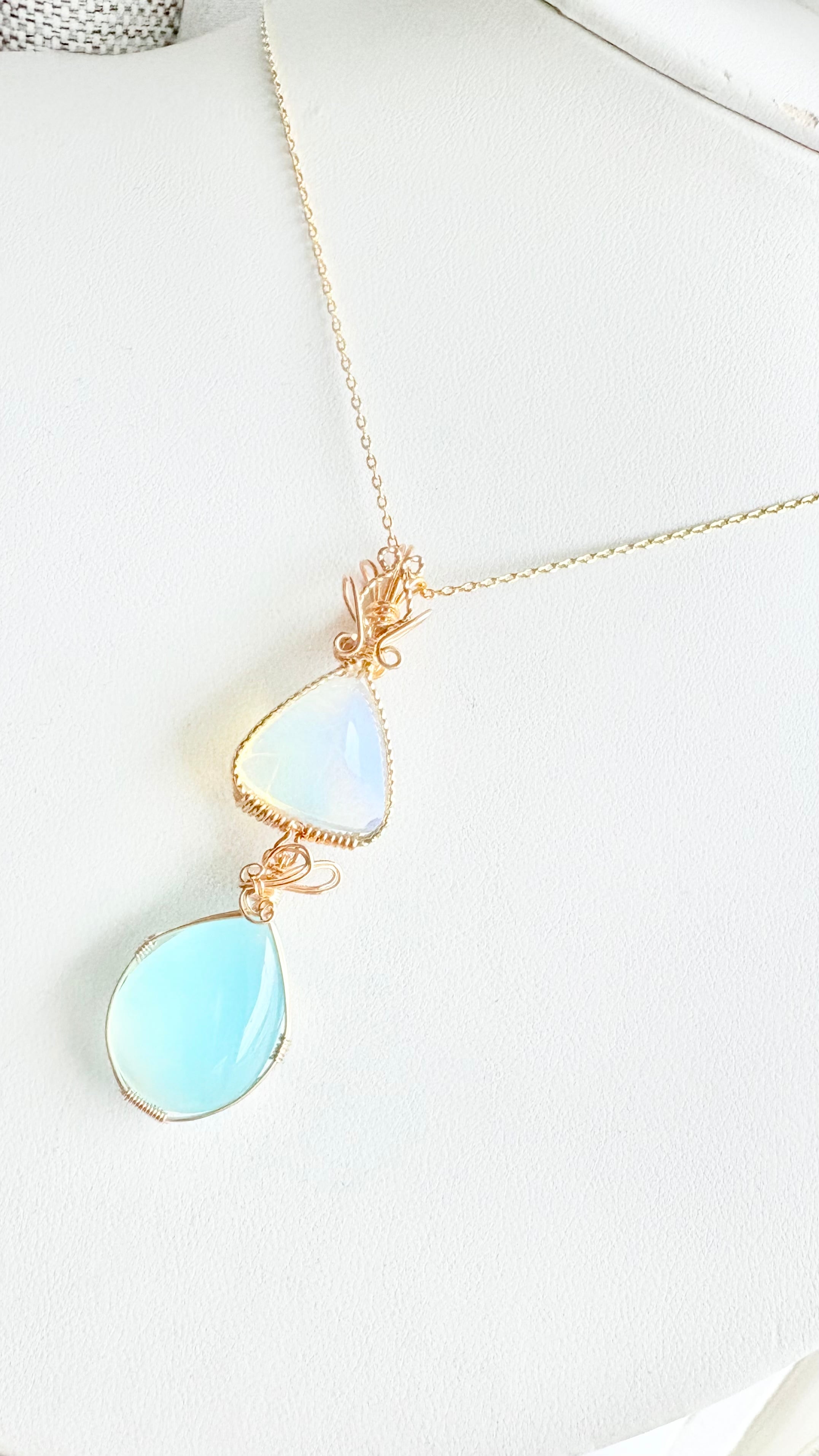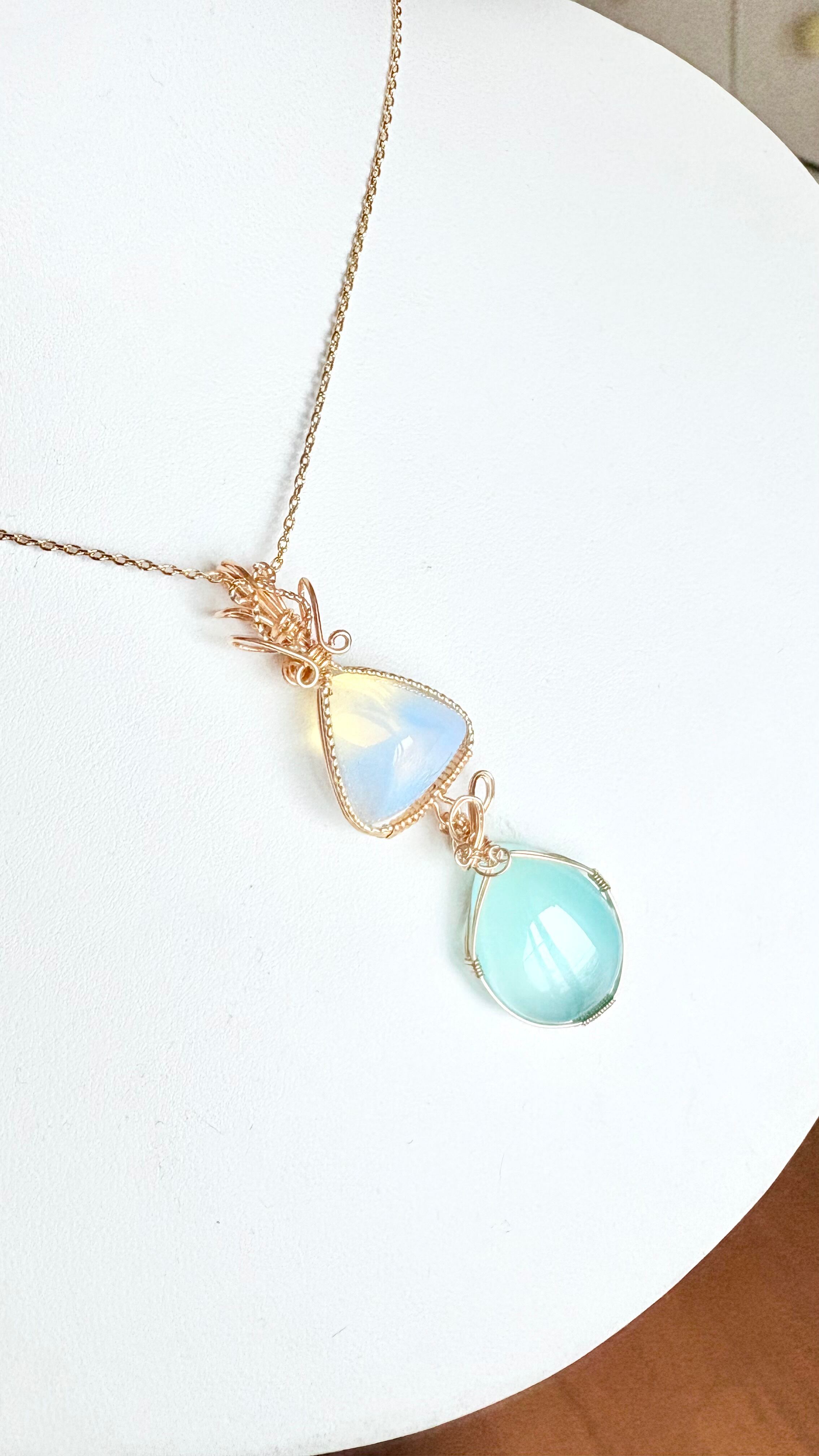 虹色のシラーが内側から溢れ出す「エンジェルオーラコズミックアイス」をトップに、沖縄の海を閉じ込めたような「シーブルーカルセドニー」を添えた、贅沢な2段仕立てのペンダントが誕生しました