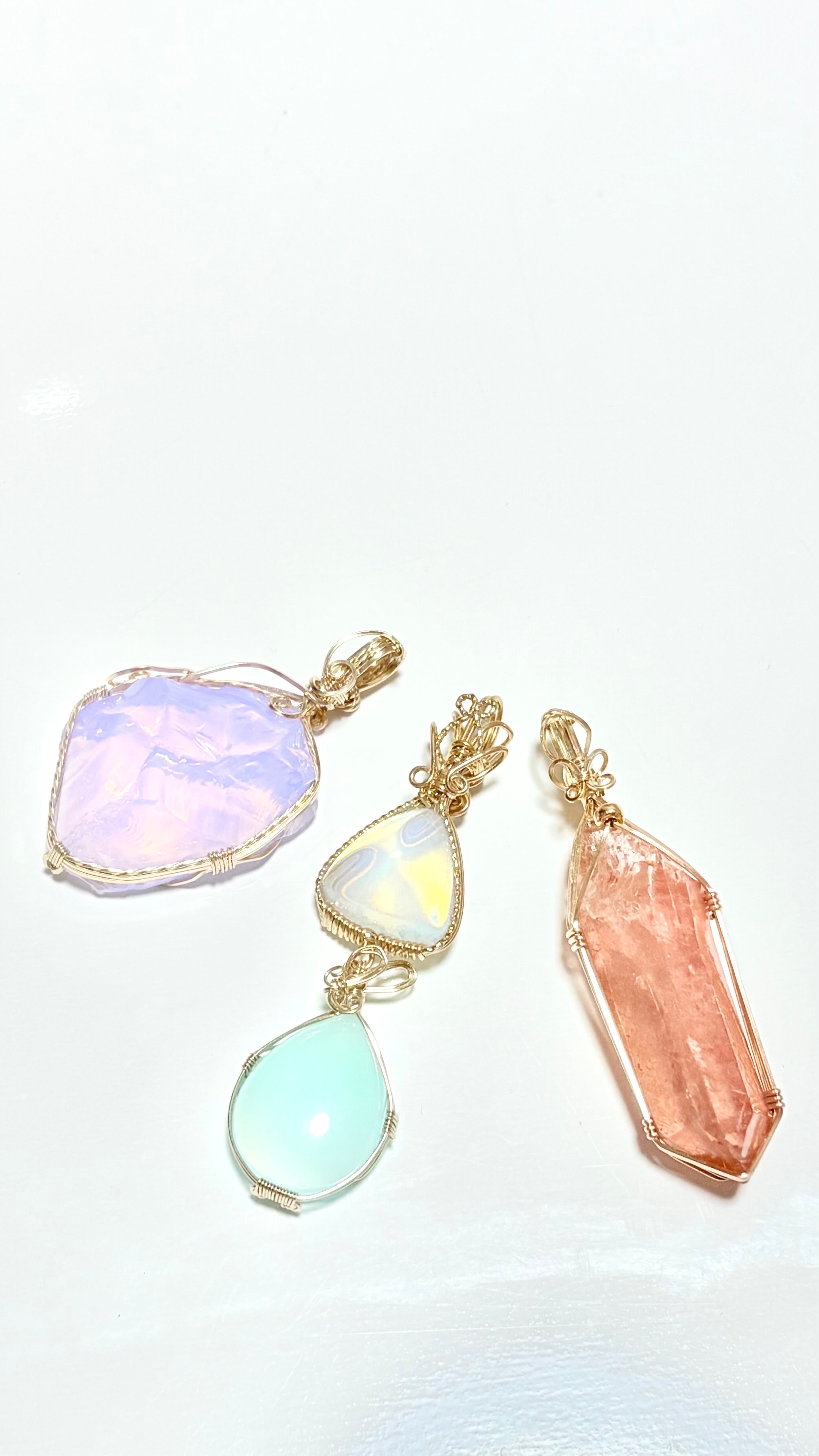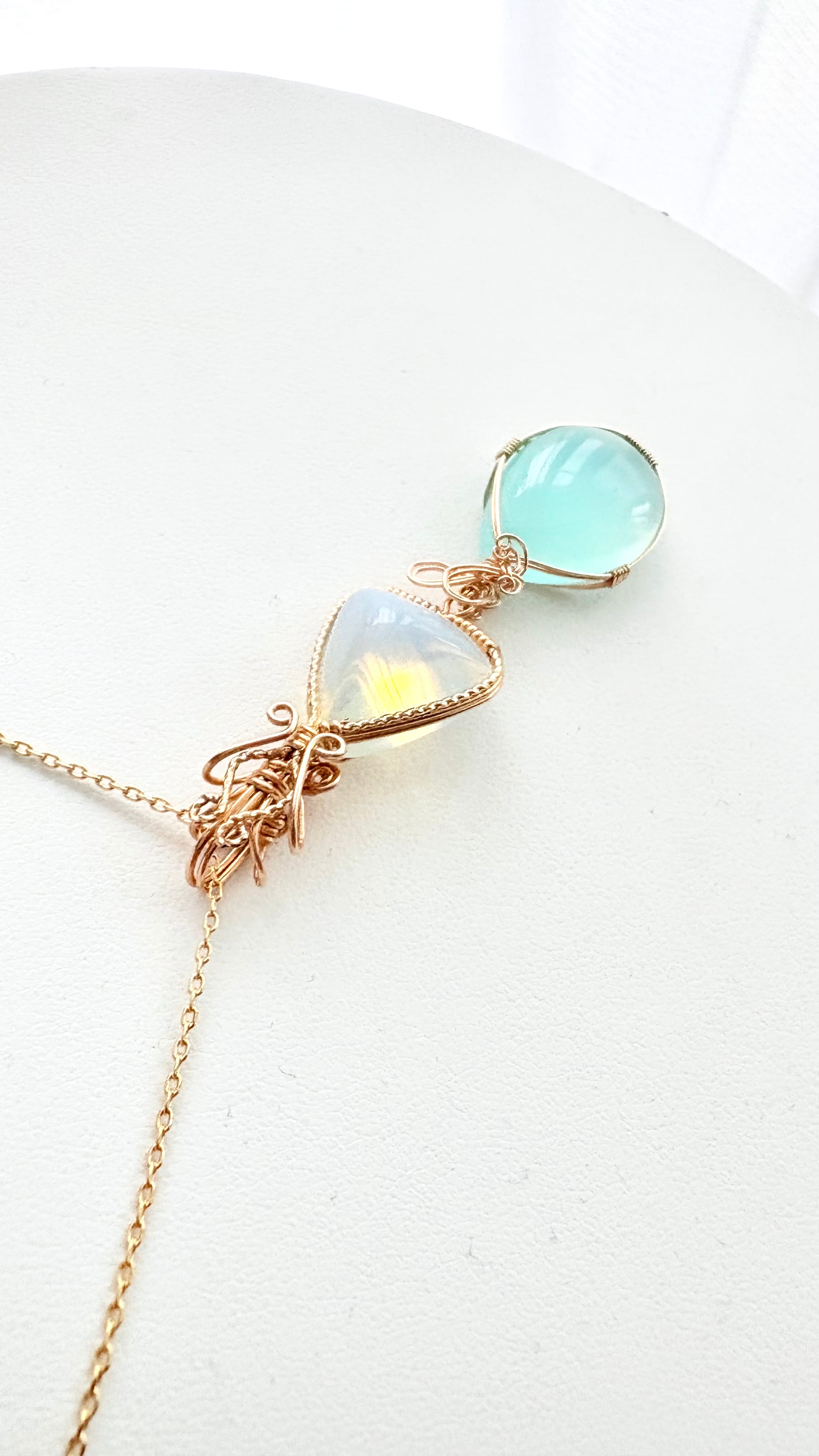 この2つの石を繊細な装飾を含めワイヤーワークで紡ぎ、静寂と光が共存する、お守りのような作品に仕上げました
