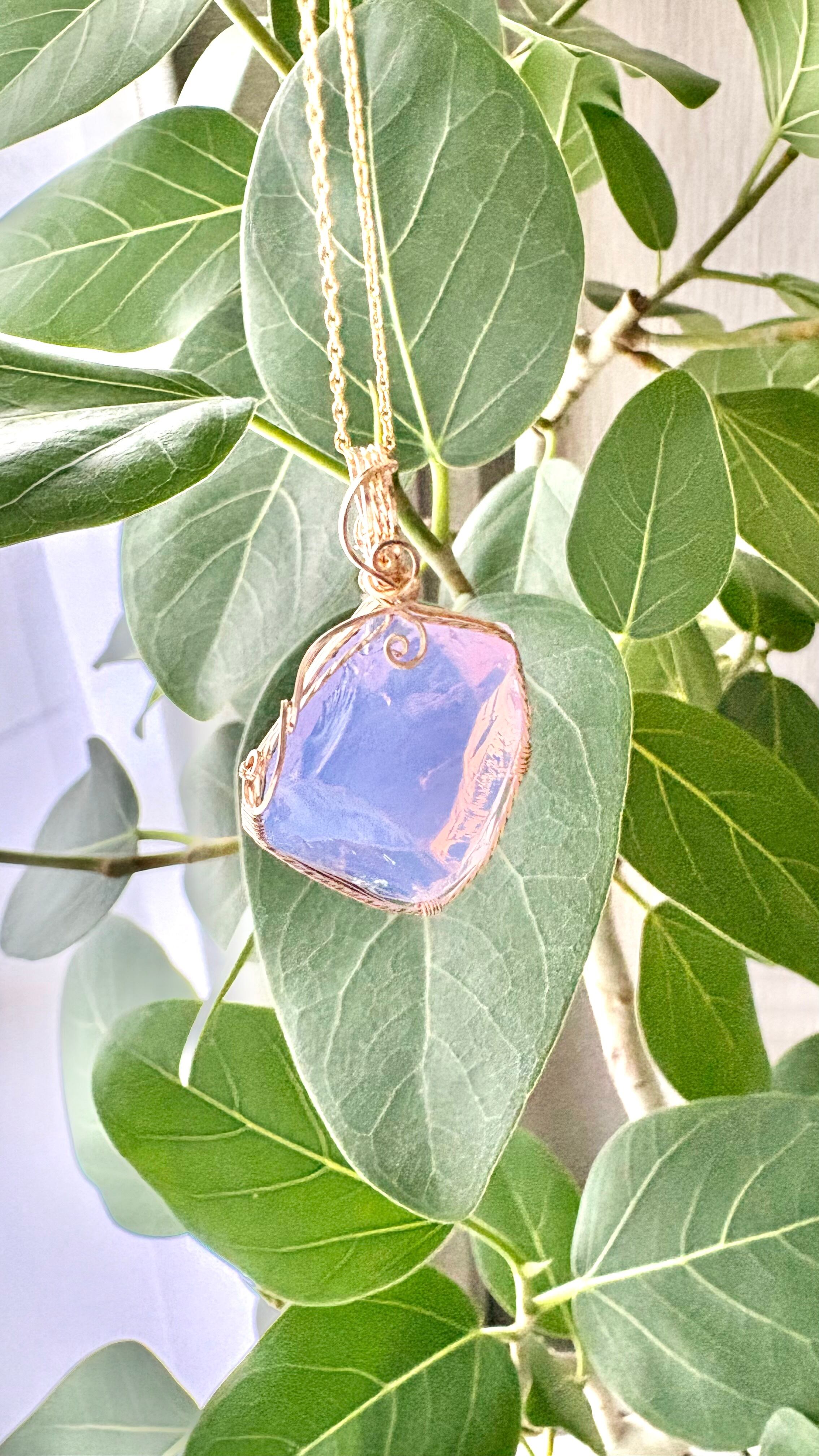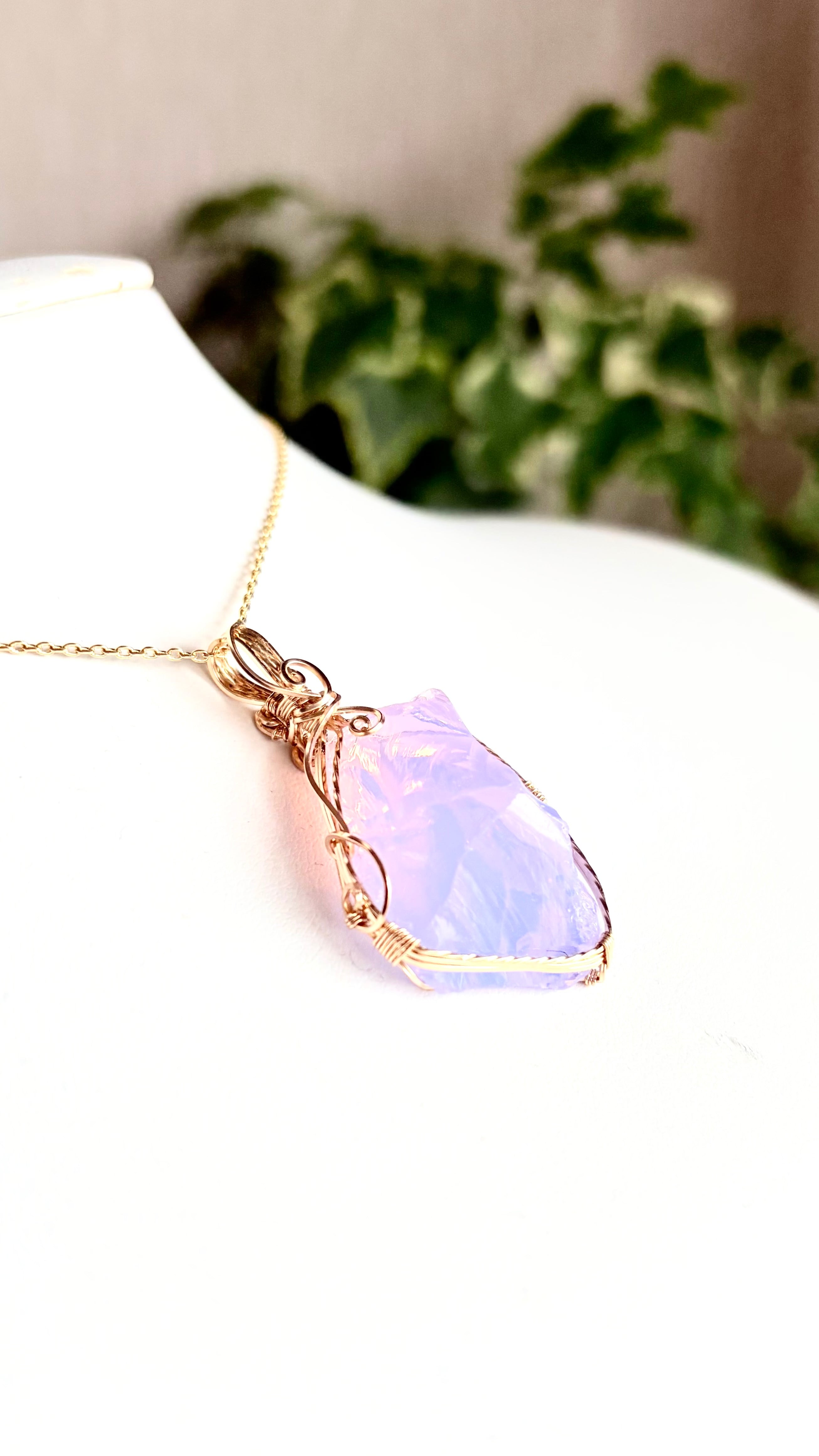 透き通るライラック色の中に、角度によってふわりと浮かぶ虹のベールが美しいクリスタル