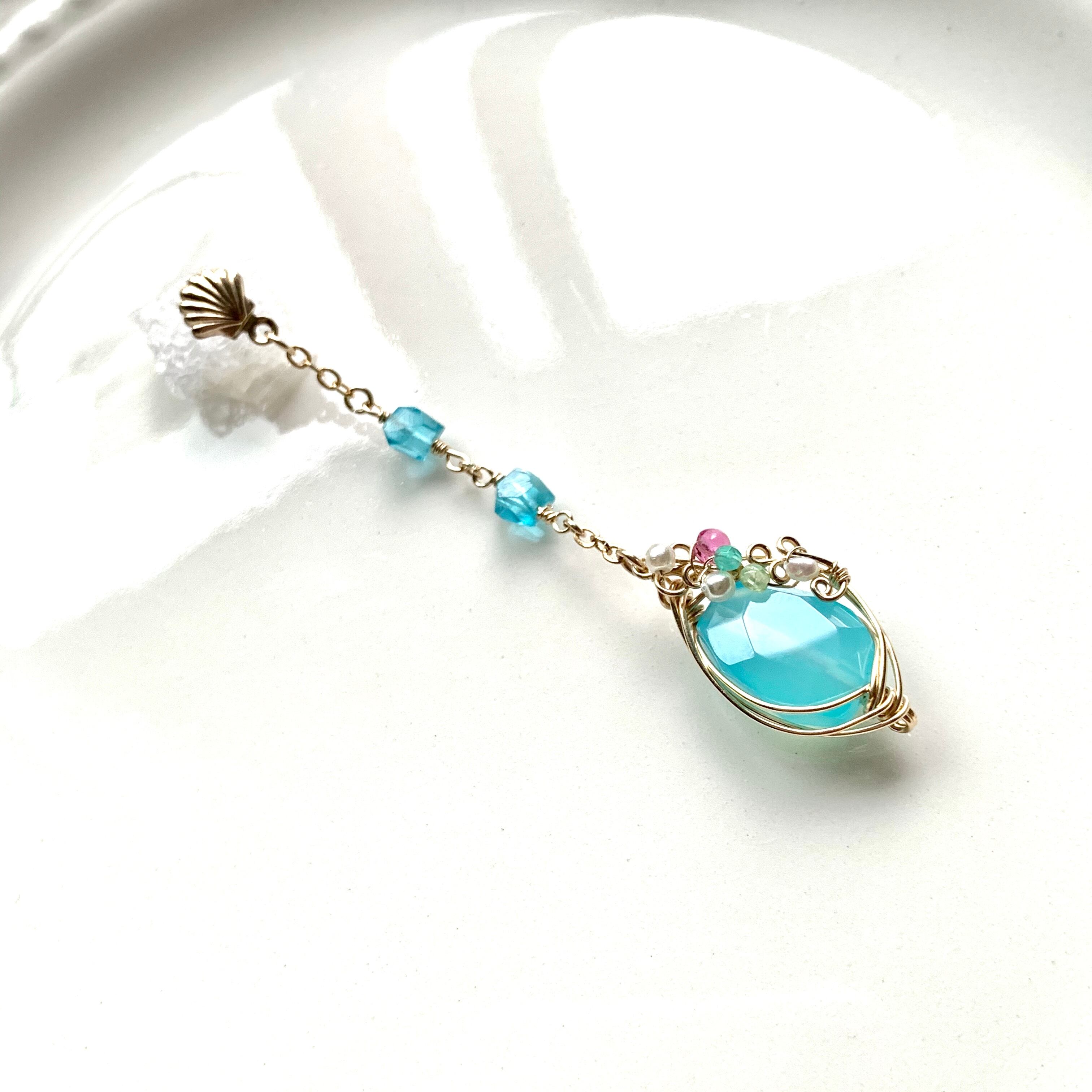 シーブルーカルセドニーの装飾には、ピンクトルマリン・淡水パール・グリーンカルセドニー・ペリドットビーズを使用しております♡