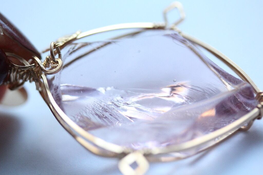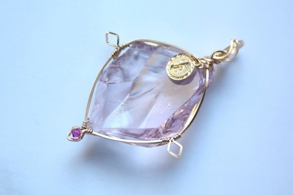 お石は平たいので、胸元でコロコロと転がりません柔らかくそれでいて凛とした雰囲気を醸し出すこのクリスタルに、14kgfメダイをあしらいました