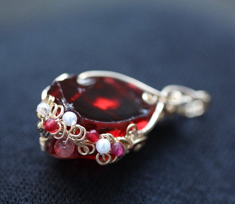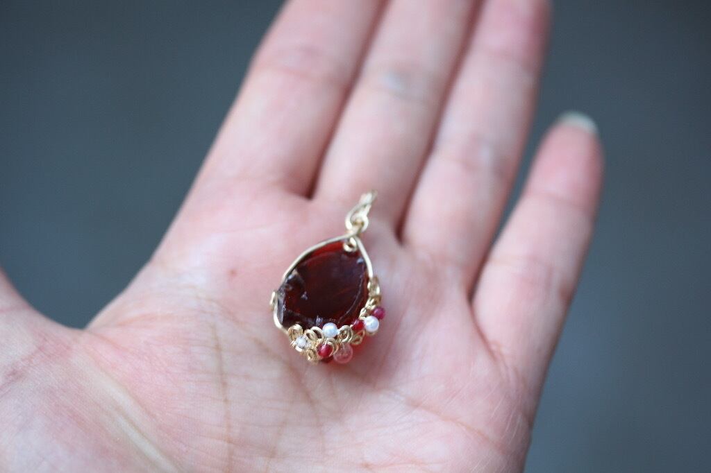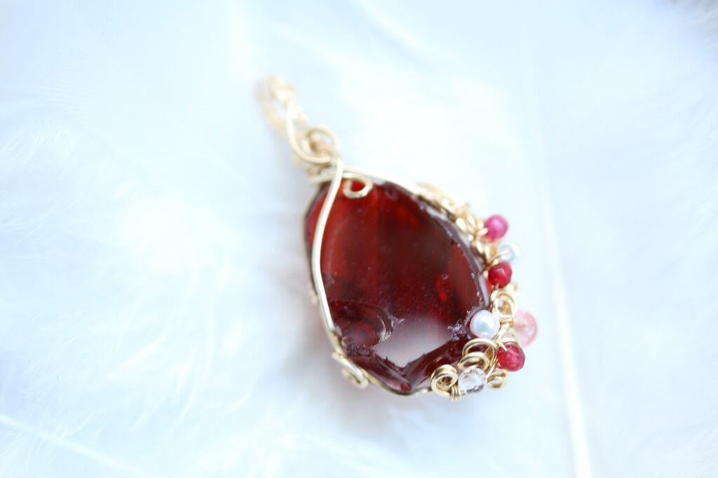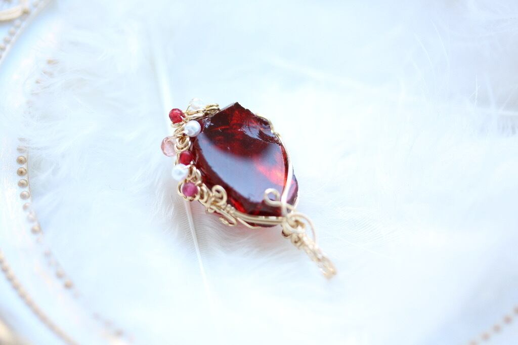 少し華やかさをと思いまして、チェリークォーツ、パール、水晶、レッドクリスタルを用いて装飾を施しています