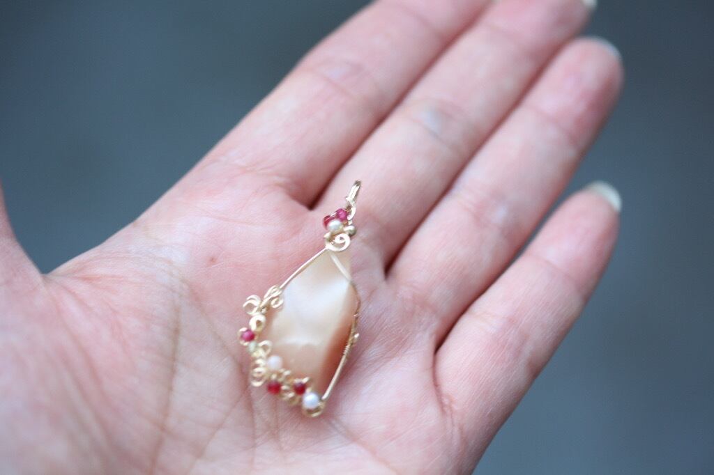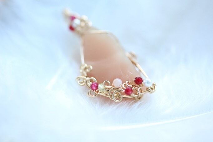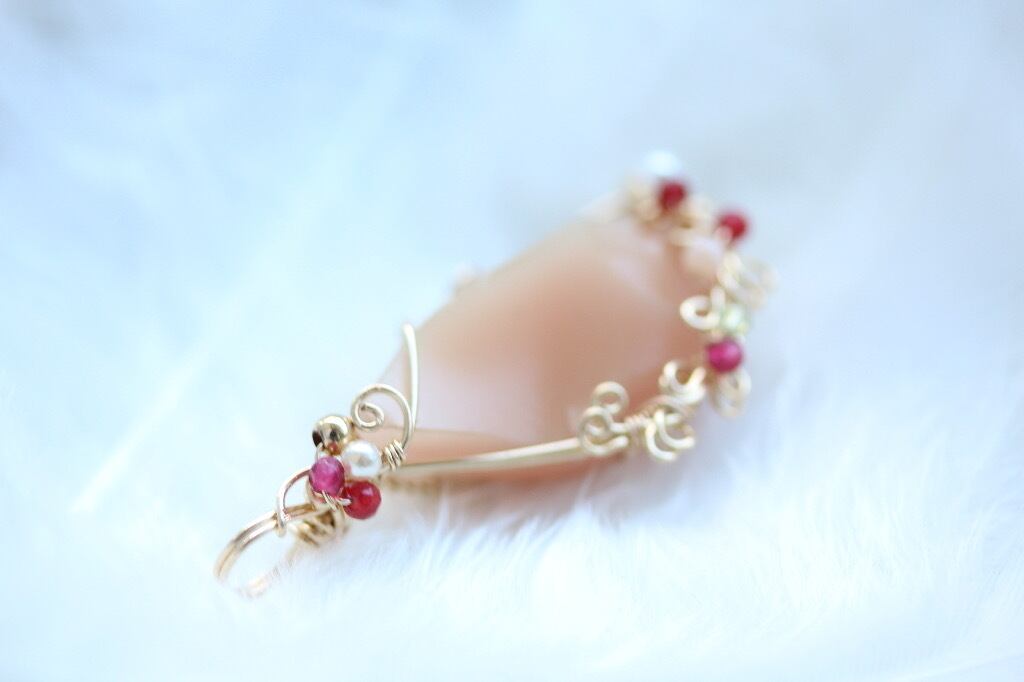 そこへパール、ロードライトガーネット、ムーンストーン、ペリドットをサポートストーンに選び、華やかな装飾を施しました♡