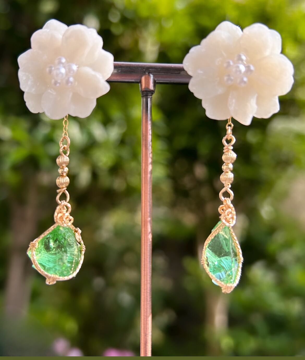 軽やかなグリーンのエメラルドシフトピアスは、耳元を花で飾るそんなイメージでお創りいたしました