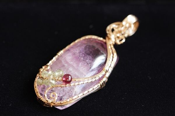 サポートストーンには、ペリドットとガーネットビーズを使用。